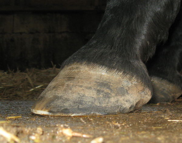 Vorgeschichte: In der Anfangszeit bei seiner jetzigen Besitzerin war das Pferd herkömmlich beschlagen. Und obwohl wohl alle beschlagstechnischen Tricks ausprobiert wurden, war das Pferd nicht reitbar. Die Hufe "zerbröselten" wohl nach ca. 1/2 Jahr Dauerbeschlag so derart, dass kein Beschlag mehr vernünftig hielt. Herkömmliche Hufbearbeitung war hier am Ende.